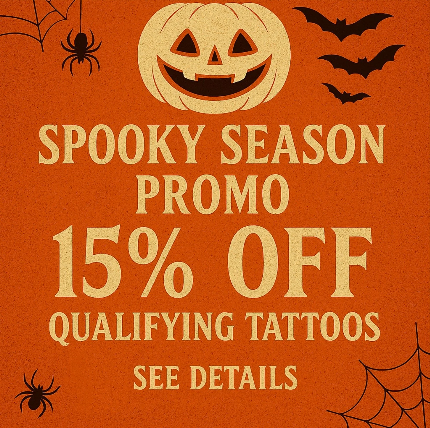 Applies only to tattoos where spooky or Halloween-inspired imagery is the main subject (examples: ghosts, bats, pumpkins, haunted houses, creepy creatures, occult symbols, etc.).